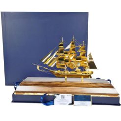 Mô hình thuyền buồm cỡ đại thích hợp trưng bày trong không gian rộng. Sản phẩm được chế tác từ vàng lá 24k cùng đế gỗ óc chó tự nhiên cao cấp. Bên cạnh đó mẫu thuyền buồm mạ vàng đi kèm túi và hộp quà sang trọng. Đây sẽ là món quà tặng sếp, quà tân gia hay mừng khai trương ý nghĩa
