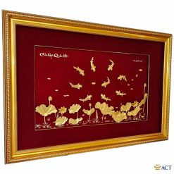 Tranh cá chép hoa sen dát vàng là một trong những sản phẩm tiêu biểu nhất của QUAVIP24K. Bức tranh nổi bật với hình ảnh hai chú cá chép khỏe khoắn đang vui đùa dưới những bông sen nở rộ. Các nghệ nhân đã rất khéo léo sắp xếp các chi tiết tạo nên một bức tranh hài hòa và sống động. Điểm đặc biệt nhất của bức tranh chính ở chất liệu vàng 24k cao cấp dát mỏng trên các chi tiết chính.