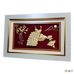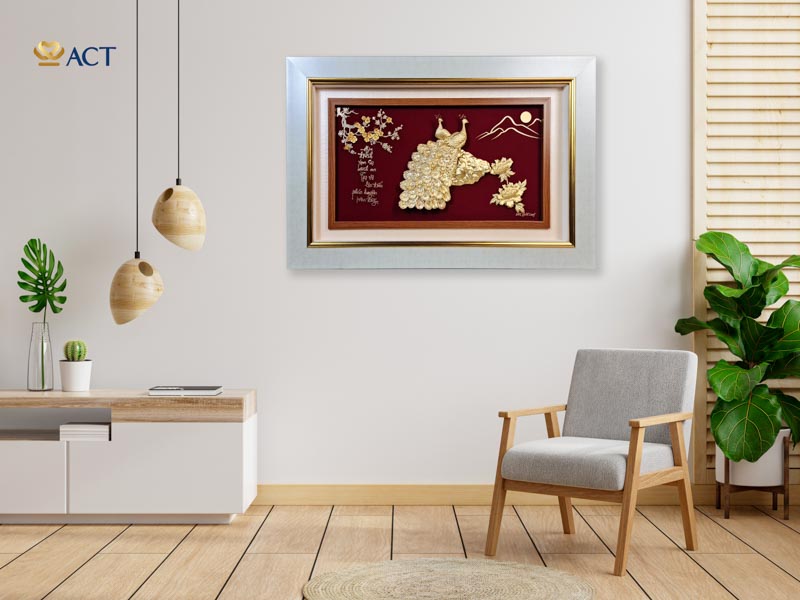 Ý nghĩa: Tranh đôi chim công hoa mẫu đơn dát vàng mang ý nghĩa về hạnh phúc, may mắn và thịnh vượng. Đôi chim công quấn quýt bên nhau tượng trưng cho tình cảm vợ chồng thủy chung son sắt. Bông mẫu đơn nở rộ cũng mang đến hạnh phúc và phú quý cho gia chủ. Tranh đôi chim công dát vàng 24k sẽ là món quà tặng sang trọng cho các dịp tân gia, khai trương, năm mới, cưới hỏi,…
