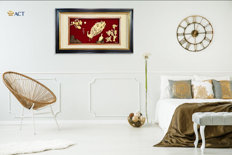 Ý nghĩa: Chim công là biểu tượng của sắc đẹp và sự thịnh vượng. Cây trúc là biểu tượng của niềm vui, sự hoan hỷ. Tất cả cùng kết hợp trong một bức tranh tạo nên một tác phẩm đầy giá trị. Bức tranh không chỉ đẹp về ý nghĩa mà còn độc đáo với chất liệu vàng 24k cao cấp. Tranh chim công dát vàng 24k sẽ là món quà tặng sang trọng cho các dịp tân gia, khai trương, năm mới, cưới hỏi,…